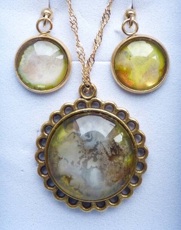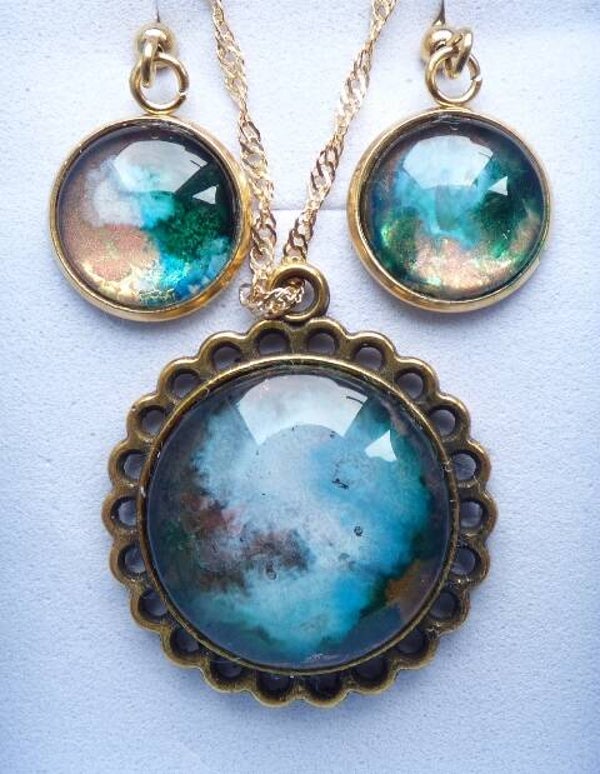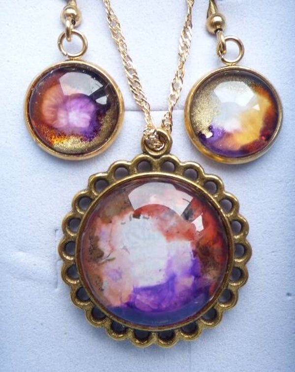 Beautiful earring and round pendant sets hand paintied and designed in attractive colours and patterns, complimenting any outfit of the discerning lady.