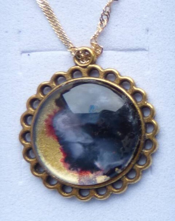 These round pendants on a riverflow chain are hand painted and differ in colour and patterns. These individually crafted pendants will be a delightful addition to any jewelry collection