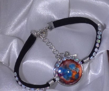 Hand painted colourful bracelets on a velvet bangle with a silver extender chain.These bracelets, decorated with rhinestone or pearls are comfortable and light to wear. Such a simple piece of jewelry is suitable for day or evening wear.